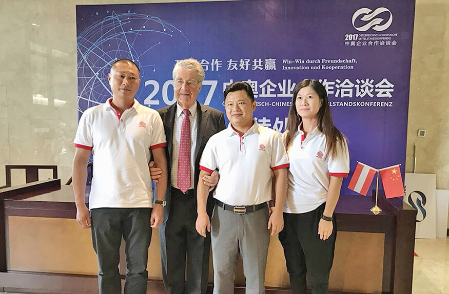 奥地利前总统海因茨·菲舍尔与333体育官网智能副总裁戴宝、揭阳分公司总经理林浩生、公司总裁助理郑庆丽合影